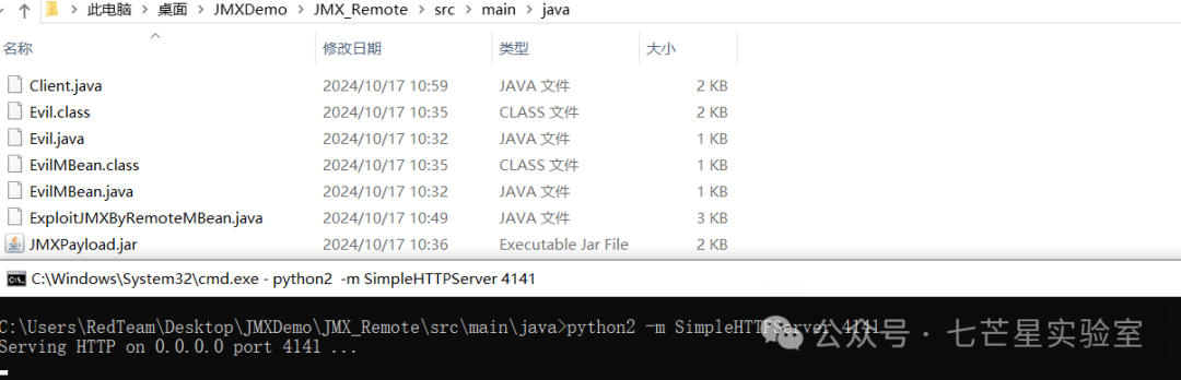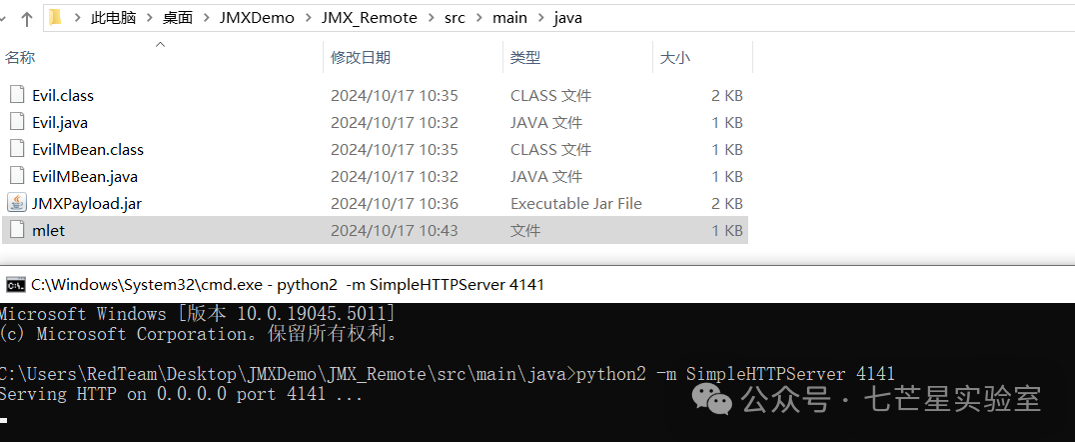 Step 4:随后将JMXPayload.jar和mlet放在网站同一目录下并启动一个简易的Web服务器