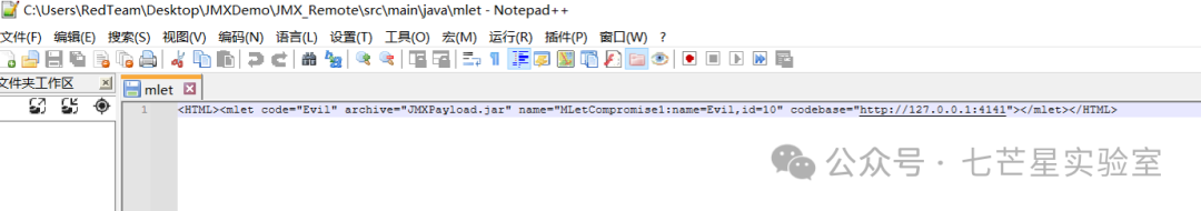 Step 3:再创建一个名为mlet的文件,该文件是给getMBeansFromURL函数使用的,通过该文件getMBeansFromURL会到远程下载JMXPayload.jar文件,内容如下: