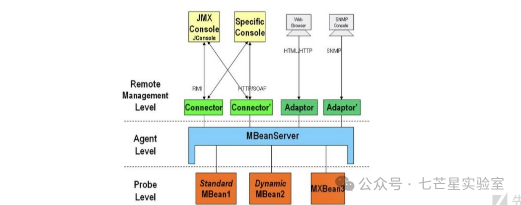 b、适配层:MBeanServer,主要是提供对资源的注册和管理 c、接入层:Connector,提供远程访问的入口