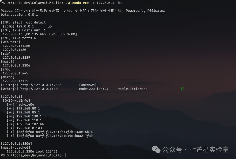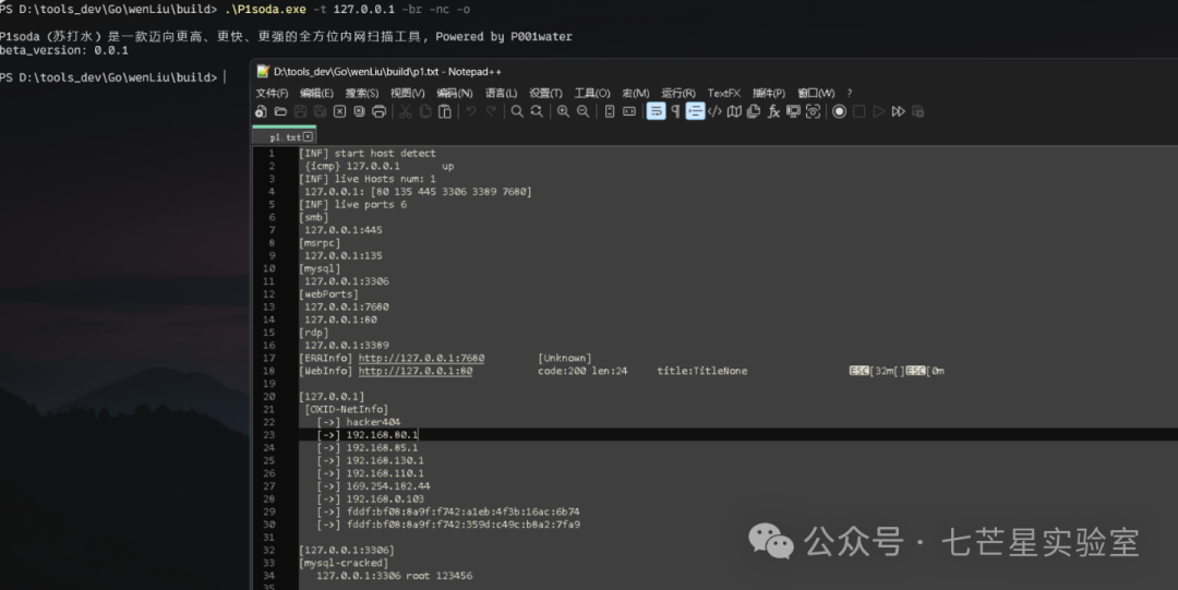 .\P1soda.exe -t 127.0.0.1 -br -nc -o // -br开启爆破模式, -o输出重定向到p1.txt, -nc取消颜色输出