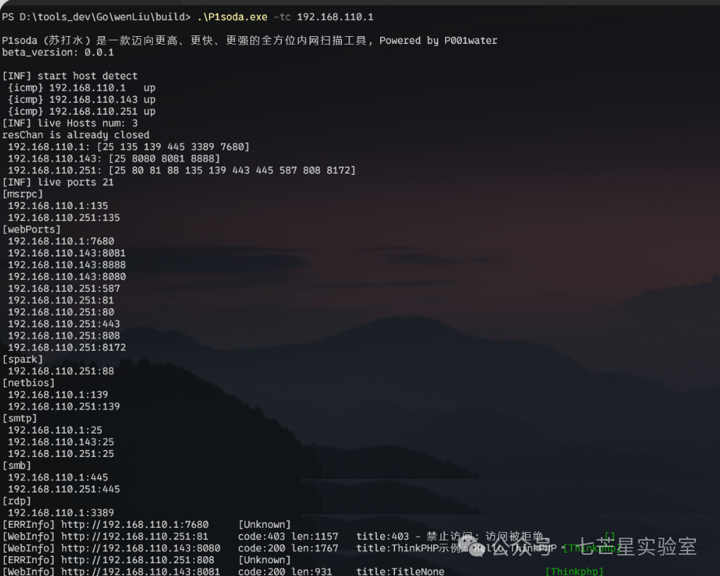 .\P1soda.exe -tc 192.168.110.229,192.168.1.1 // 探测192.168.110.229,192.168.1.1两个C段