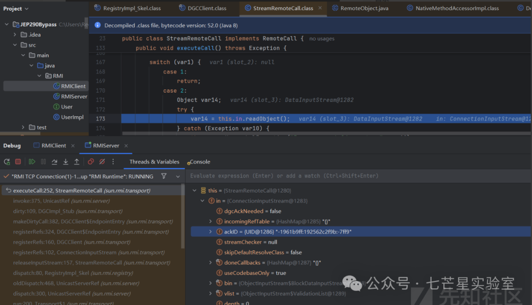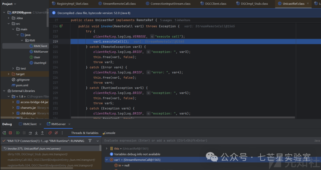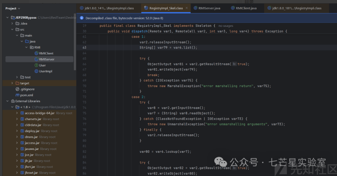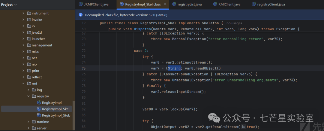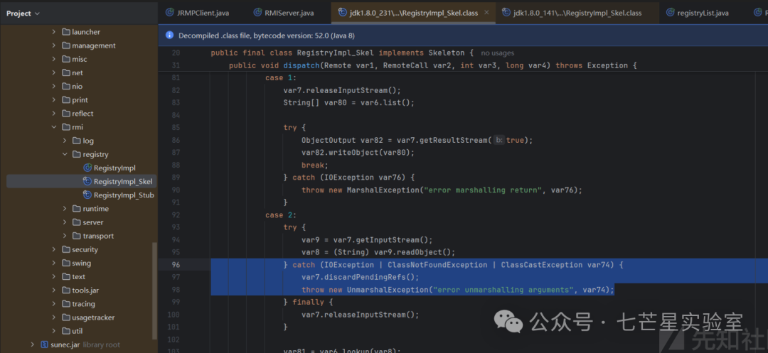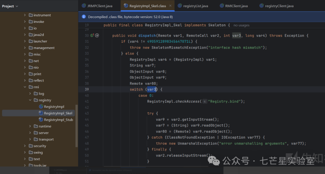 JDK 8u141之后可以利用lookup+JRMP(JRMP是为了绕过JEP290,此为8u121之后必须条件)来绕过checkacces并且实施攻击,在之前的RMI通信源码调试分析中我们了解到注册中心时反序列化的点在RegistryImpl_Skel#dispatch中,其中var3代表客户端发起连接的方法