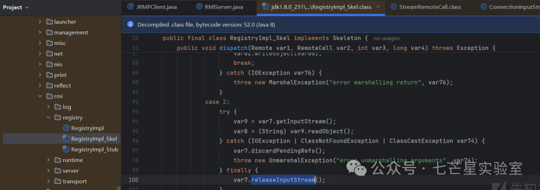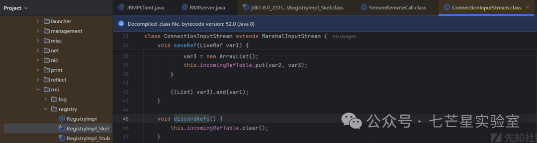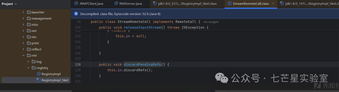 在JDK 8u231中RegistryImpl_Skel#dispatch中的每个case都增加了ClassCastException,执行到反序列化时会因为反序列化返回的对象类型不是String而报错,从而调用StreamRemoteCall#discardPendingRefs