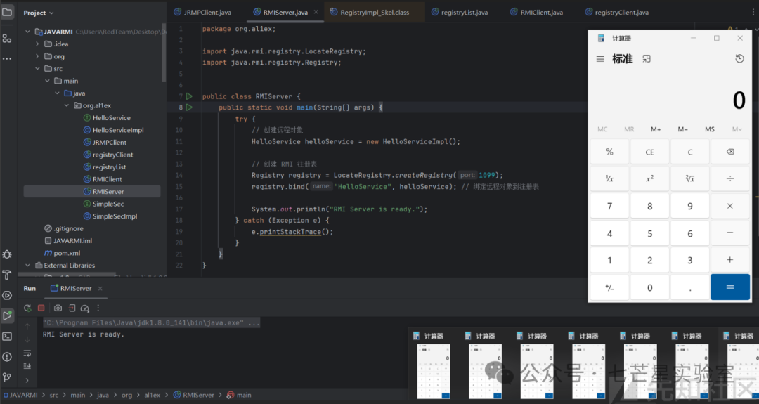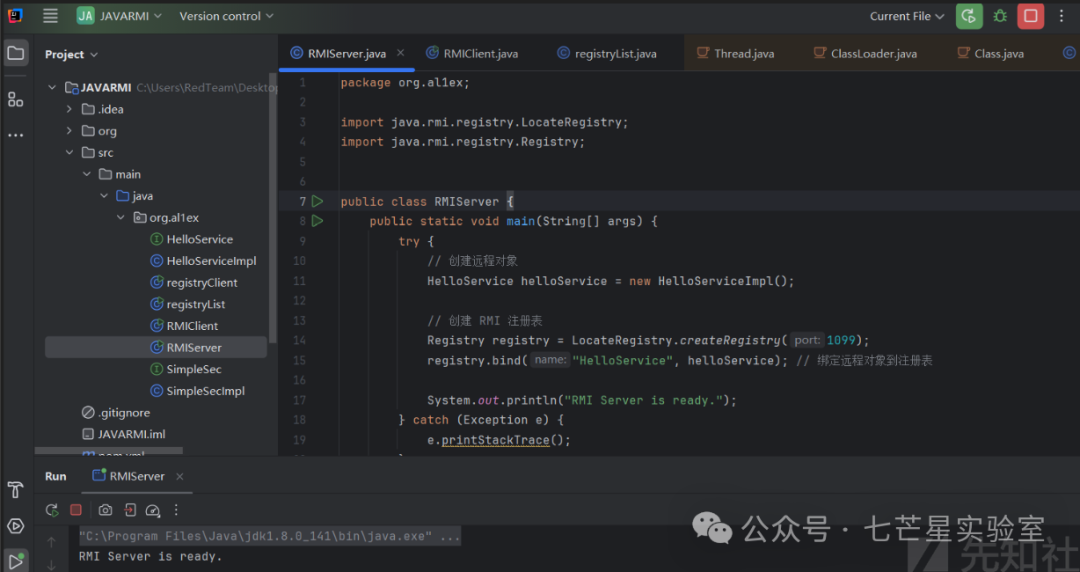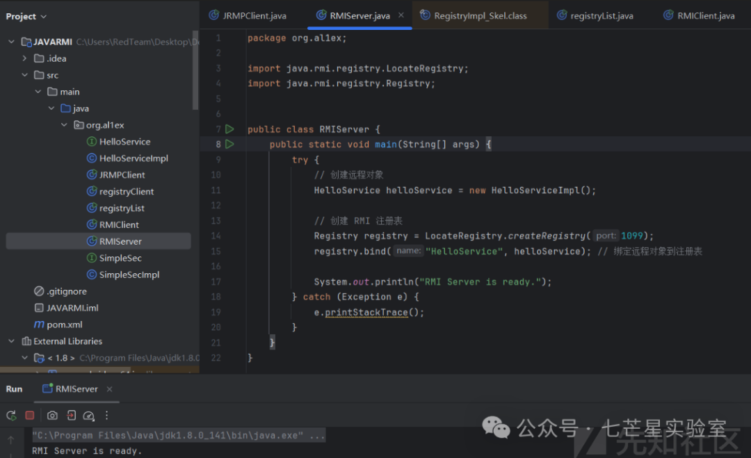 下面我们本地启动一个JAVA RMI服务端,然后让本地局域网内的其他主机来模拟客户端来实施攻击操作,利用的方法为bind方法,具体利用流程如下: Step 1:首先启动服务器端