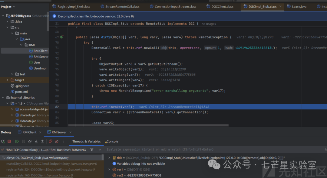 下断点调试可以发现注册中心在DGCimpl_Stub的ditry中跟JRMP开始建立连接,首先通过newCall建立连接,随后通过writeObject写入要请求的数据,invoke来处理传输数据并将数据发送到JRMP端,跟入this.ref.invoke(var5);