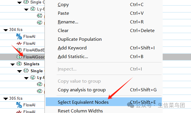 比如想要对中性粒细胞进一步分析,那可以先把Ly6G+的细胞圈出来。然后右键选中Ly6G+细胞,Select Equivalent Nodes