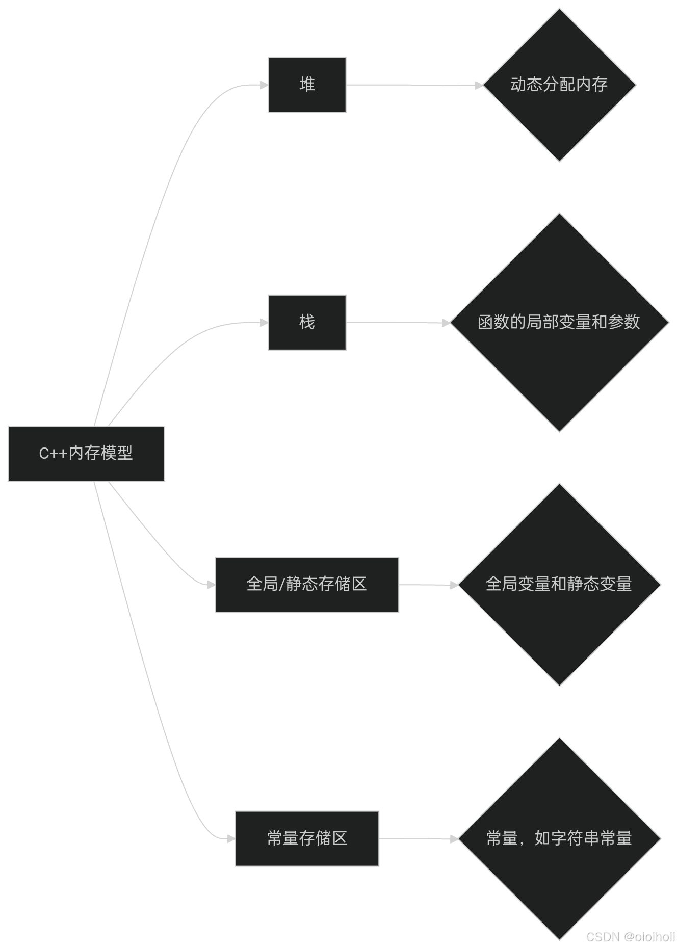 在我们平时编写的C++代码中,根据变量的生命周期和作用域,它们可能会分布在不同的内存模型中。