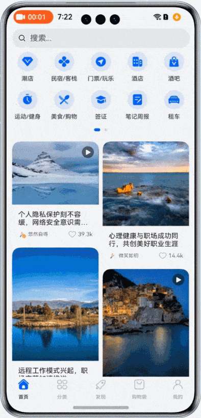本文以一个瀑布流案例,使用上述提到的部分优化手段,实现了页面的流畅滑动。本案例页面包含SearchBar + Swiper + WaterFlow + 底部导航栏等功能,顶部功能区由Swiper嵌套Grid组件实现,瀑布流使用WaterFlow组件实现,FlowItem组件内容由图文卡片、视频卡片、直播卡片构成,每个列表项中标题文本和用户信息结构是相同的,对相同UI结构进行了复用,避免了无用的层级嵌套。