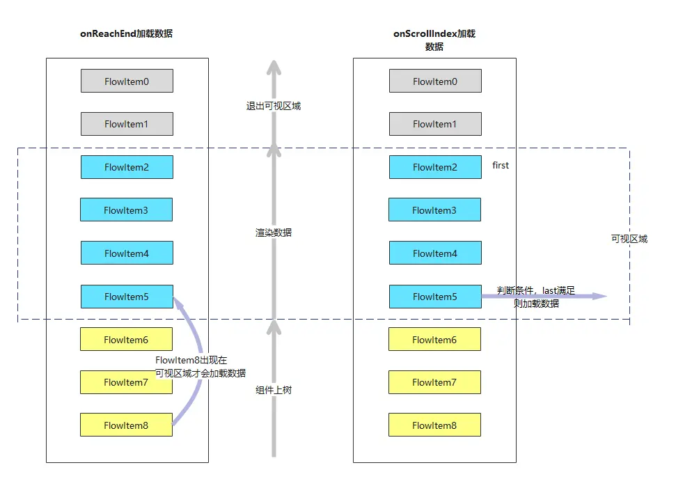 实际开发过程中,瀑布流布局里的数据一般不会被一次性加载完,而是每次加载一定量的数据。这样的话,就需要在应用滑动时加载数据。同时,如果在滑动过程中就加载了新的数据,那么配合懒加载与缓存列表项的话,缓存中的数据在未使用完就能得到补充,因此用户滑动中就不会感觉到数据加载,从而实现无限滑动的效果(具体效果参见实践总结章节)。同时,由于提前加载了数据,因此不会在某一时刻存在大量组件需要创建渲染的情况,减少了因同一时间创建大量组件而导致丢帧的情况。