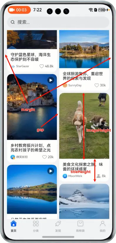 另外,由于Image组件默认异步加载,提前设定FlowItem的高度,可以避免图片加载成功后高度变化触发的瀑布流布局刷新。