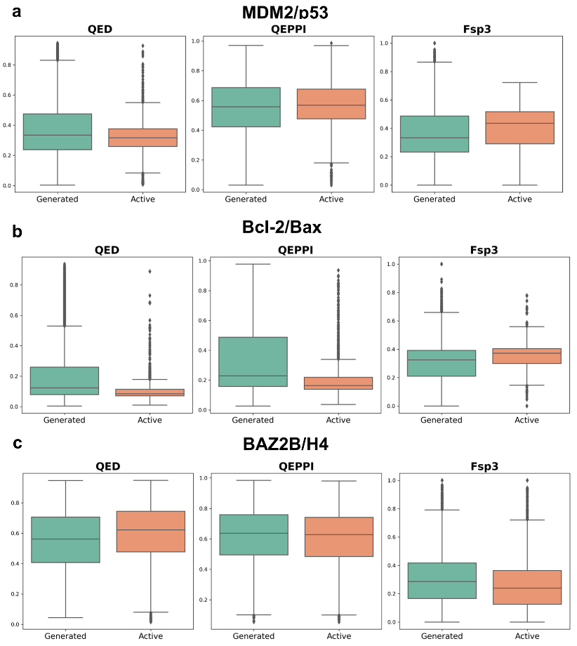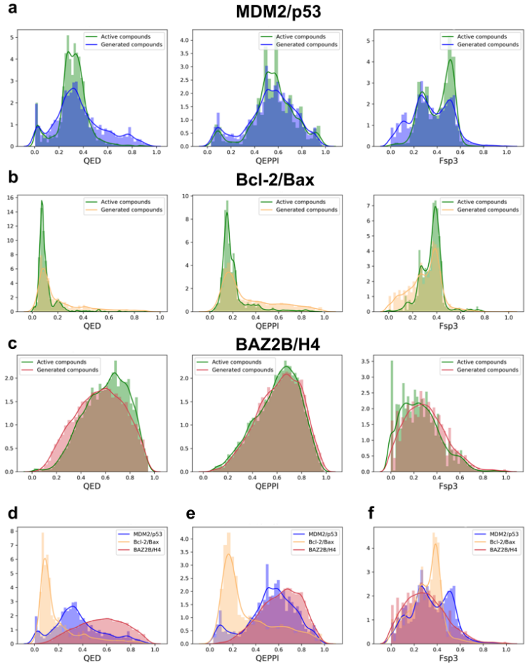 随后,研究人员比较了针对MDM2/p53、Bcl-2/Bax和BAZ2B/H4的活性化合物与生成化合物的QED、QEPPI和Fsp³分布(图2)。结果表明,生成化合物的类药性分布与所有三个PPI界面靶点的活性化合物高度相似。这表明源自PPI界面特征的条件输入在引导生成过程向生物学相关化合物方向发展方面起到了关键作用。