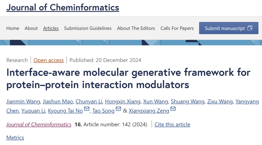 Wang, J., Mao, J., Li, C. et al. Interface-aware molecular generative framework for protein–protein interaction modulators. J Cheminform 16, 142 (2024).