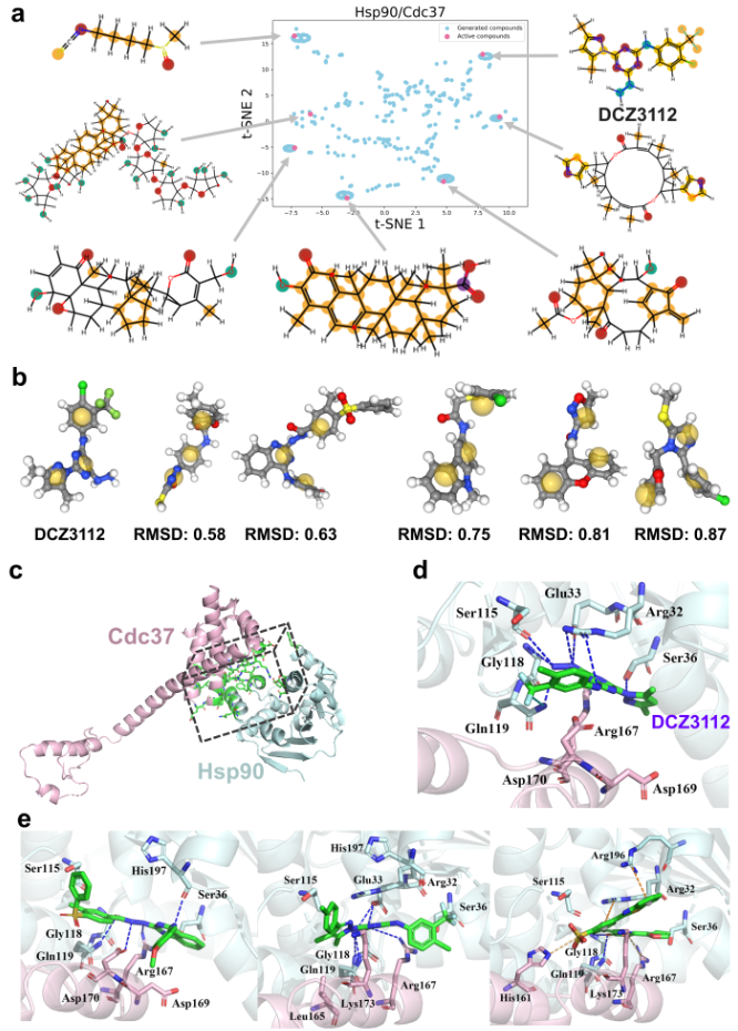 为了进一步评估生成化合物的化学相关性,研究人员以一种新型三嗪衍生物DCZ3112为基础进行基于药效团的匹配分析。结果显示,生成的前5个化合物在药效团和形状特征上与DCZ3112相似,表明模型成功学习了破坏Hsp90-Cdc37相互作用所需的关键特征,即使输入数据有限。