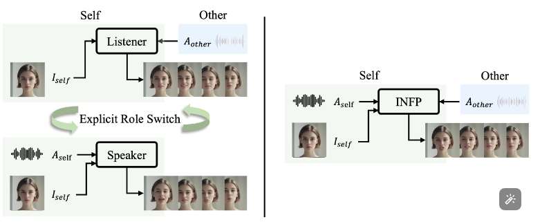 现有的交互式头部生成(左)采用手动角色分配和显式角色切换。我们提出的 INFP(右)是一个统一的框架,可以动态、自然地适应各种对话状态。