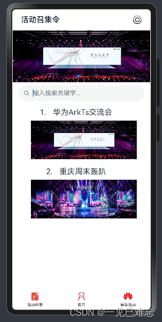 Tabs组件:这是一个包含多个选项卡的组件,每个选项卡都有一个与之相关联的内容。选项卡的位置是在底部(barPosition: BarPosition.End)。TabContent组件:这是每个选项卡的内容组件。代码中有三个TabContent组件,分别对应不同的选项卡。Swiper组件实现图片轮播,显示两张图片。Search),支持根据输入的关键字过滤活动。filterText进行过滤,并提供报名功能。活动信息包括标题、类型、时间、地点等。Web组件展示一个Web页面,链接是'https://www.huawei.com/cn/events'。Tabs组件设置了一些全局属性:scrollable(true) 允许滚动。vertical(false) 水平方向排列。barMode(BarMode.Fixed) 固定选项卡栏。onChange 事件处理器,当选项卡切换时更新this.mCurrentPage。总体来说,这段代码实现了一个包含多个选项卡的界面,每个选项卡有不同的功能和展示内容。界面包括图片轮播、搜索框、活动列表、头像和功能按钮、以及展示外部网页的选项卡。