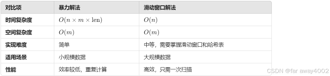 O(n^2 * m),无法处理较大规模的输入。暴力解法适用于简单场景,但由于其复杂度较高,仅在输入规模较小时可用。实际应用中推荐使用滑动窗口算法(时间复杂度 O(n))。