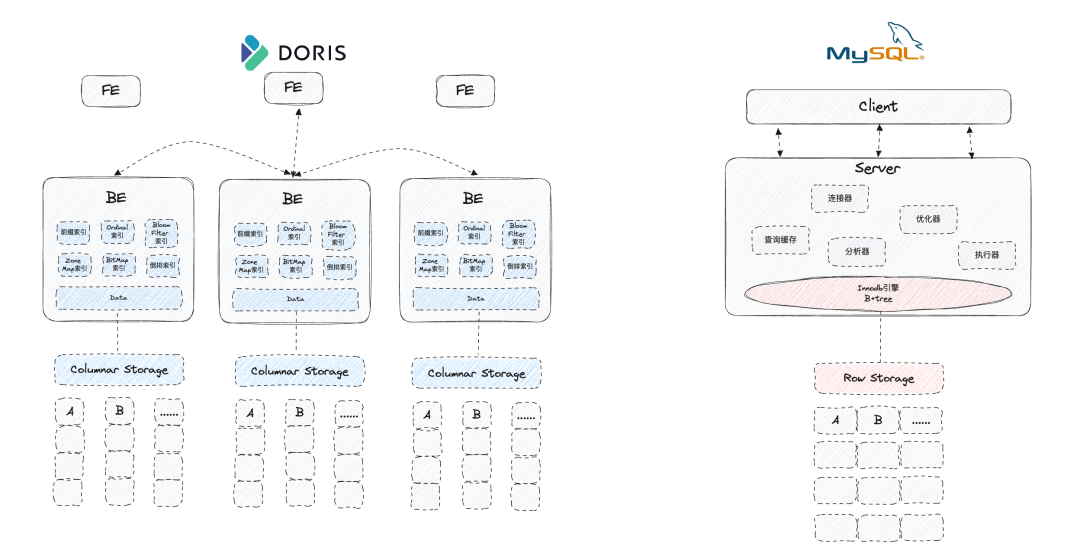 接下来,咱们从OLAP(Apache Doris为例)和OLTP(Mysql为例)的DB架构、数据结构以及存储结构3个维度来一探究竟吧!