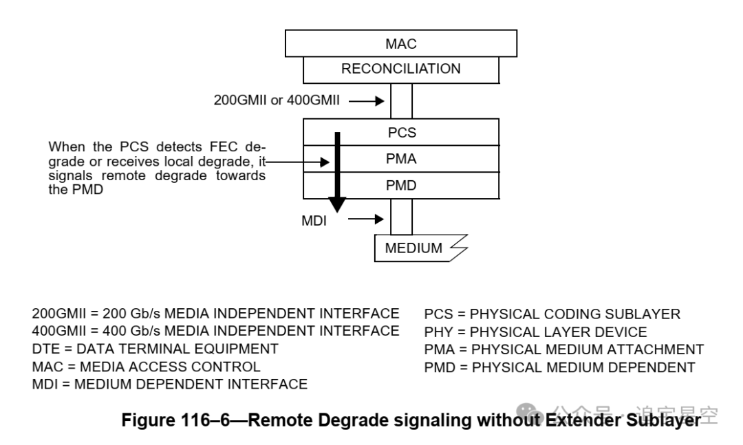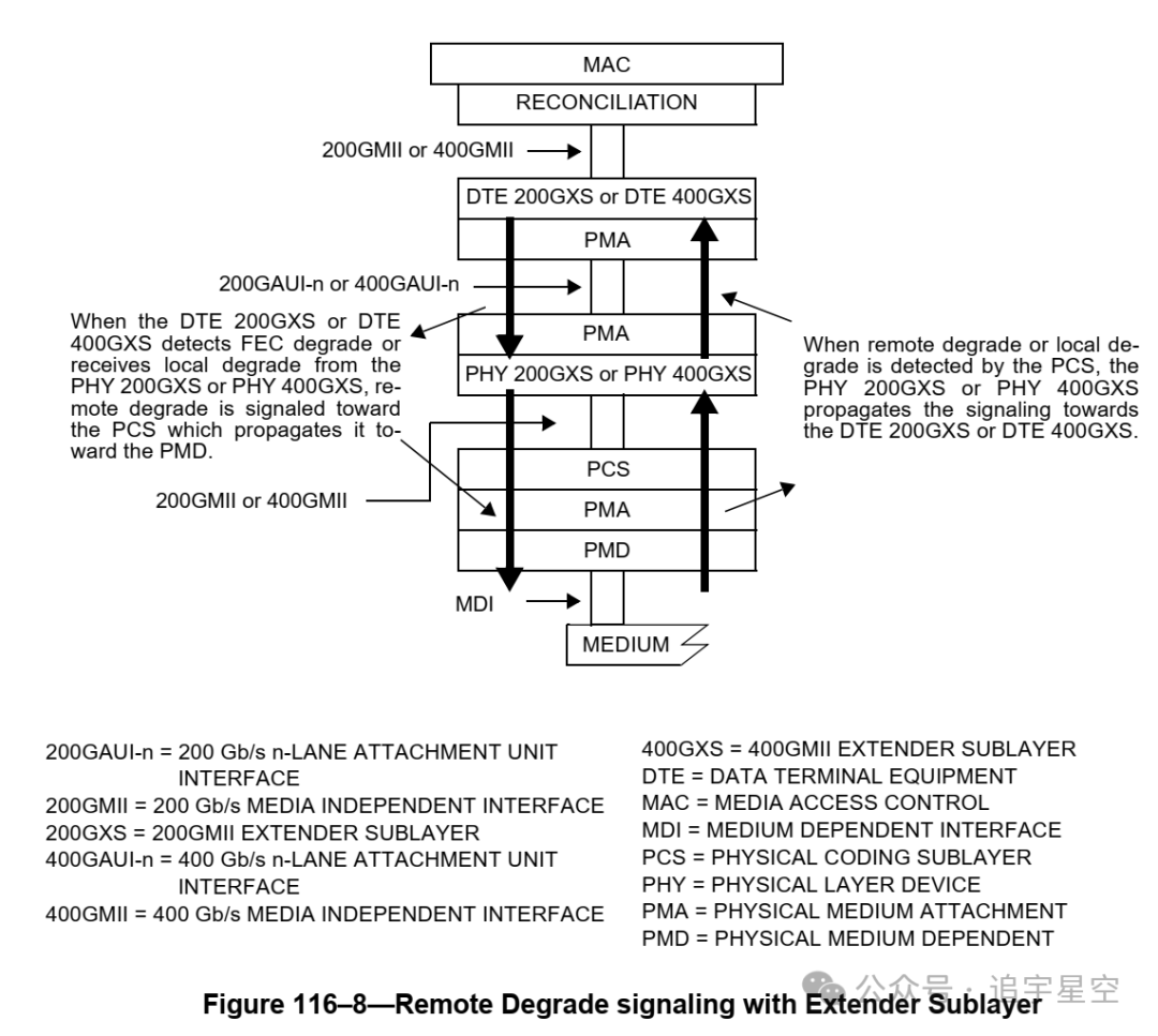 如果实施400GXS,其功能应与400GBASE-R PCS相同,但增加了118.2中定义的功能(FEC Degrade)。单个设备可以配置为400GXS或400GBASE-R PCS,并且可以通过不同的可选管理寄存器进行管理。