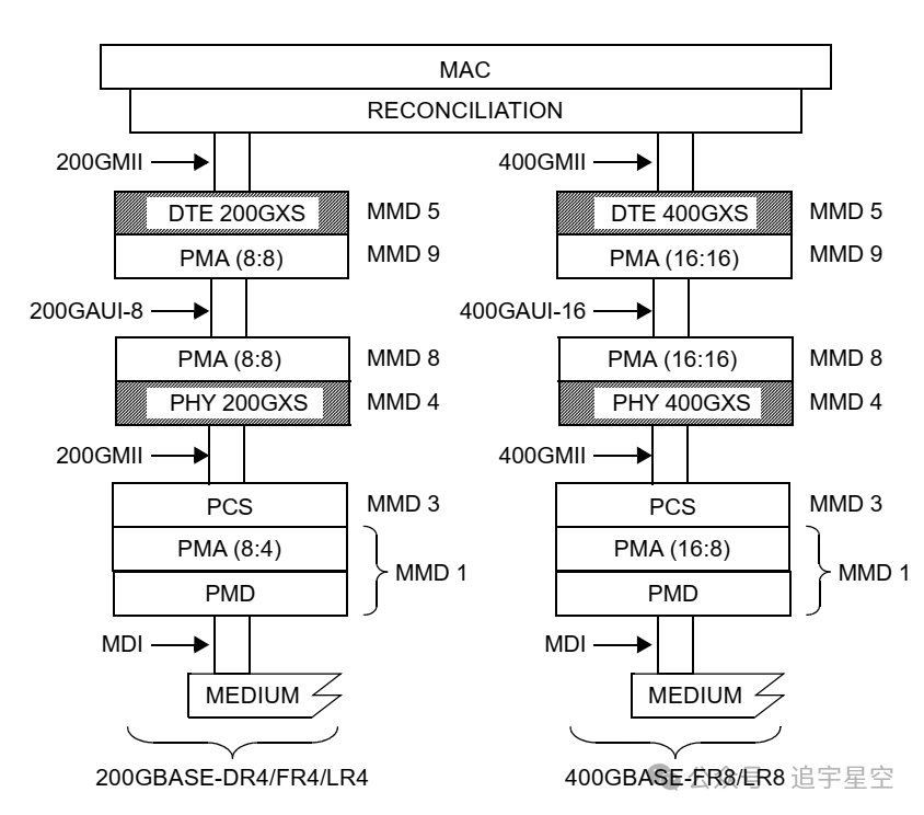 b) 可选的200GMII/400GMII扩展器可以插入调协子层和PHY之间,以透明地扩展200GMII/400GMII的范围