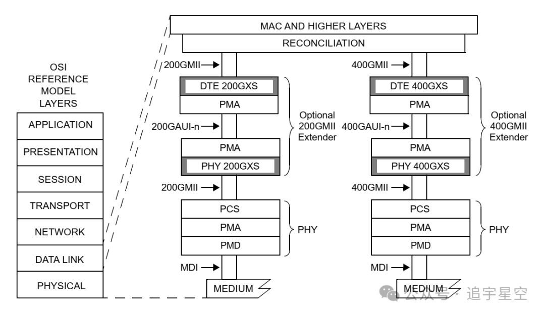 本条款定义了可选的200GMII扩展器和200GMII扩展子层(200GXS)以及可选的400GMII扩展器与400GMII扩展个子层(400GXS)的功能特性。下图显示了200GMII/400GMII扩展器和200GXS/400GXS子层与其他子层与ISO开放系统互连(OSI)参考模型的关系。