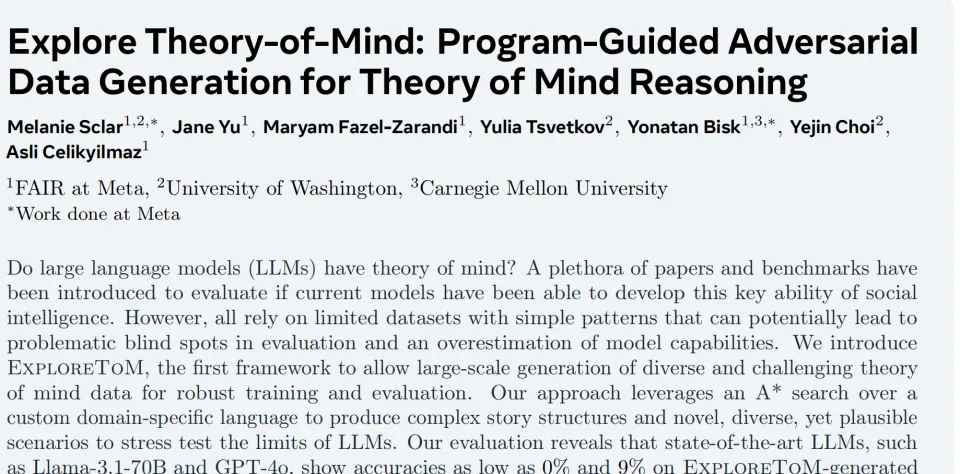 12月,Meta的研究团队发布了一篇名为《Explore Theory-of-Mind: Program-Guided Adversarial Data Generation for Theory of Mind Reasoning》的研究报告。
