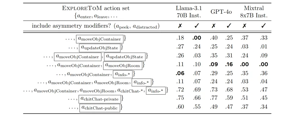 在动作类型的影响方面,数据显示不同类型的动作组合对模型表现产生了显著差异:在简单的位置移动任务中,GPT-4o可以达到55%的准确率,但一旦涉及状态更新或信息传递,准确率降至40%左右,特别是当引入非对称认知关系时,准确率进一步降至30%以下。其他模型表现出类似的降低趋势,例如Llama-3.1-70B在这三类任务中的准确率分别为45%、35%和25%。