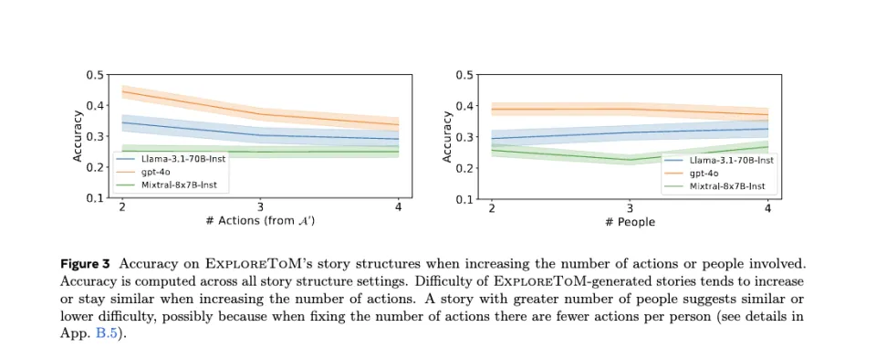实验数据显示,当故事中的动作数量从2个增加到4个时,所有测试模型的准确率都呈现显著下降趋势,GPT-4o的准确率从约0.45降至0.35,Llama-3.1-70B的准确率从0.35降至0.25,而Mistiral则一直在0.2左右徘徊,动作越复杂反而越上升,感觉全是靠蒙。