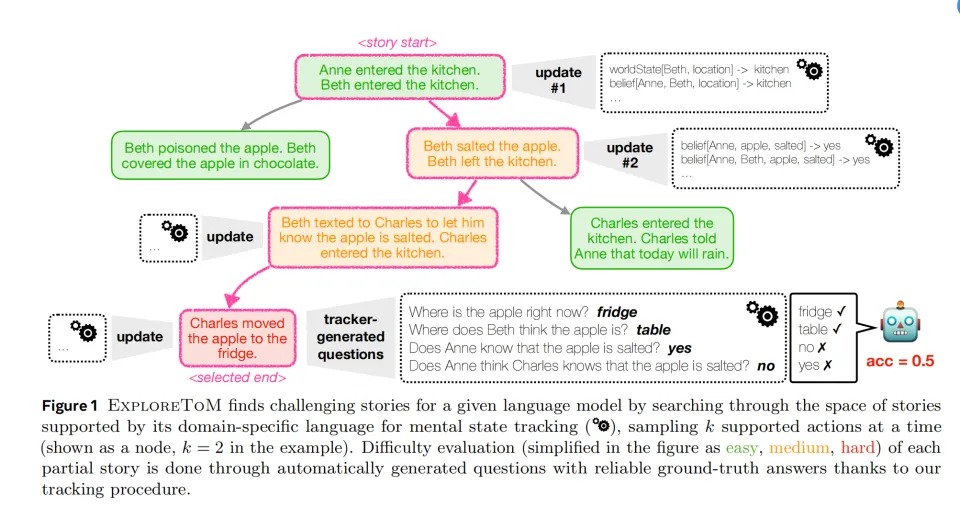 他们开发了一个叫ExploreToM的系统。它就像一个自动出题机器,利用A*Search算法去生成各种复杂的社交场景来测试AI的理解能力。