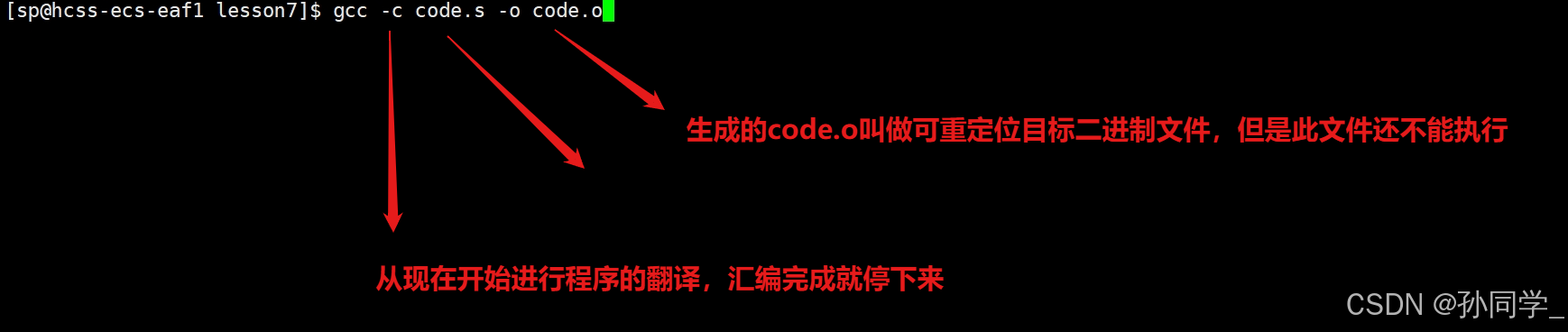 .s文件转成目标文件-c就可看到汇编代码已转化为.o的二进制目标代码了gcc –c code.s –o code.o 例如:gcc –c code.s –o code.o