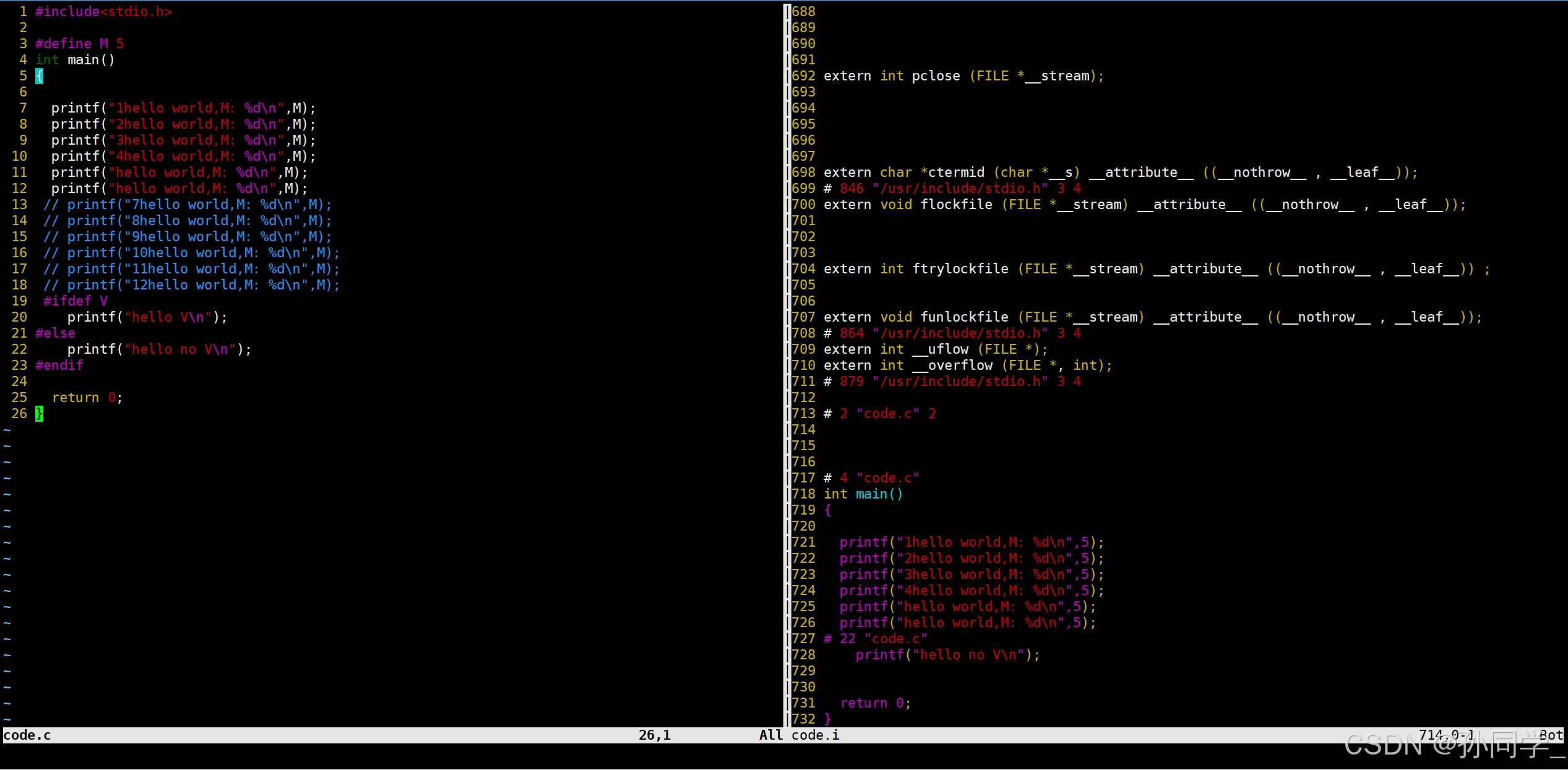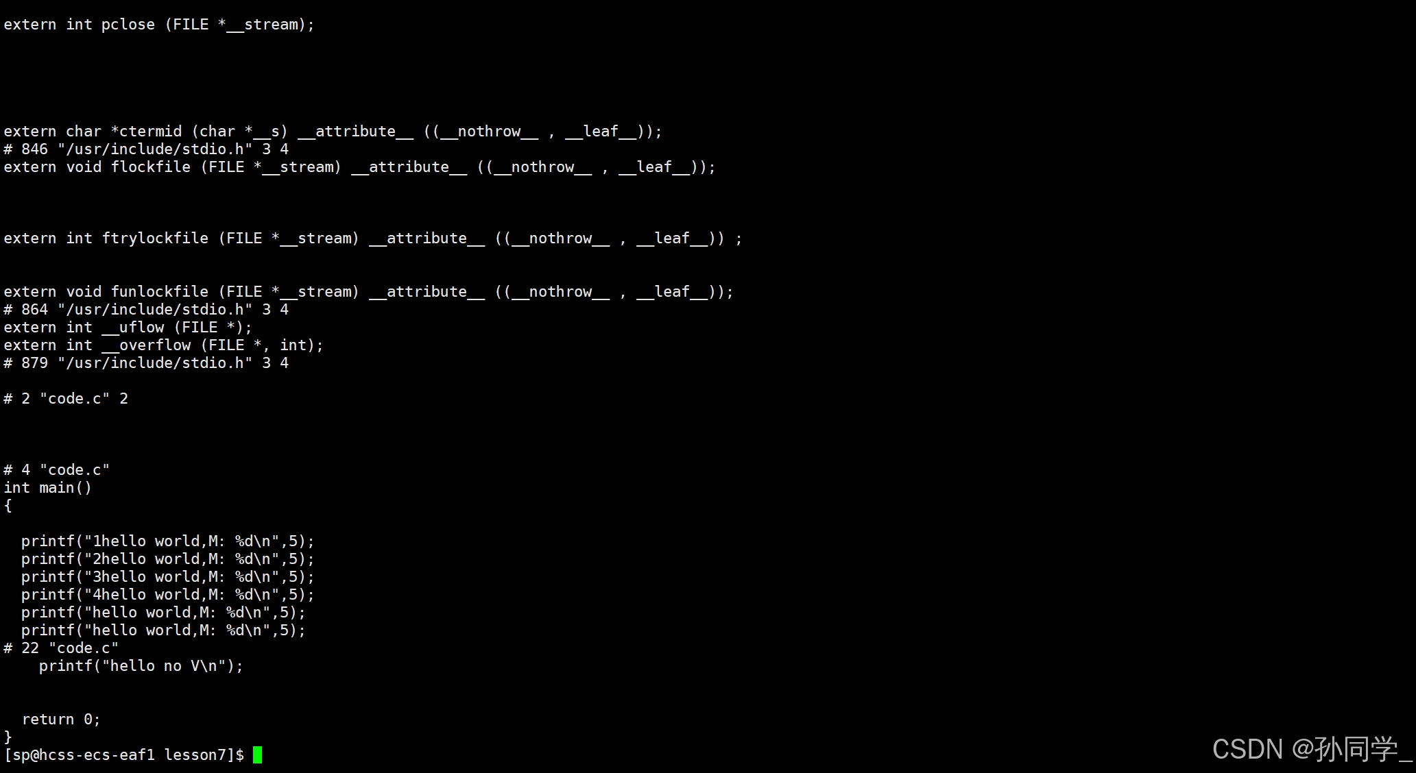 这里如果不带-o选项,直接-E,它会把所有代码预处理的结果直接给我们打印到显示器上,不便于我们的查看和分析。