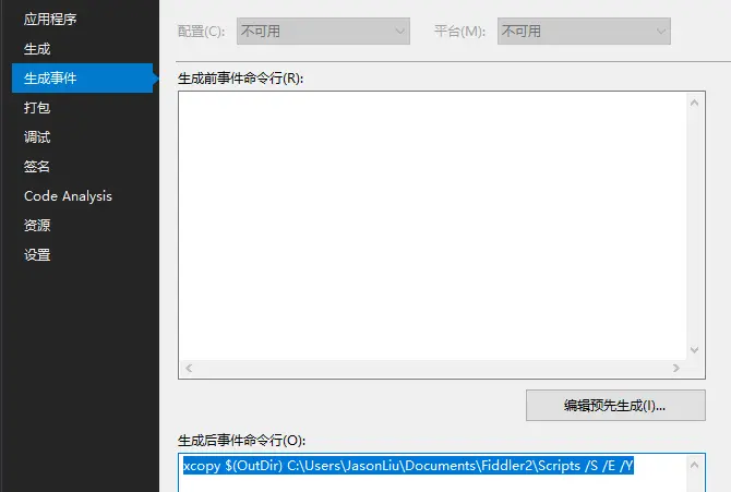 xcopy $(OutDir) C:\Users\JasonLiu\Documents\Fiddler2\Scripts /S /E /Y