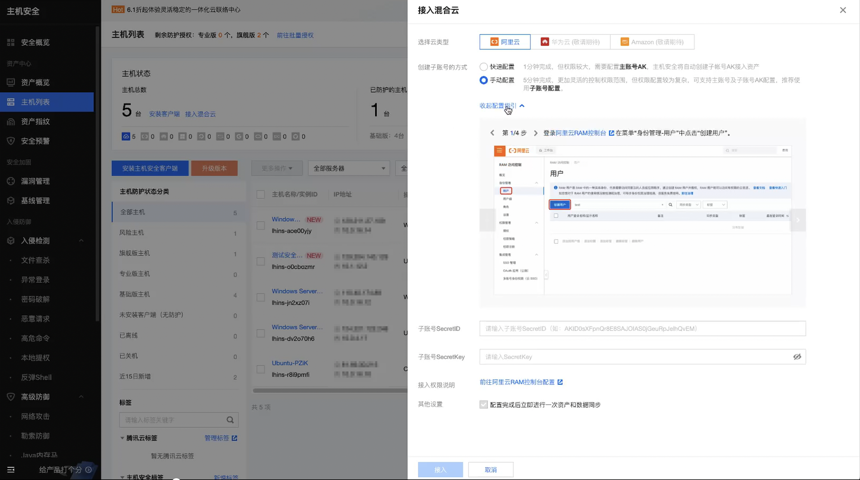 当然这个地方除了能够看到现在的所有资产,以及主机是啥类型的也可以安装客户端,并且这个地方是支持其他云的,比如阿里云啊这种也是可以进行配置的