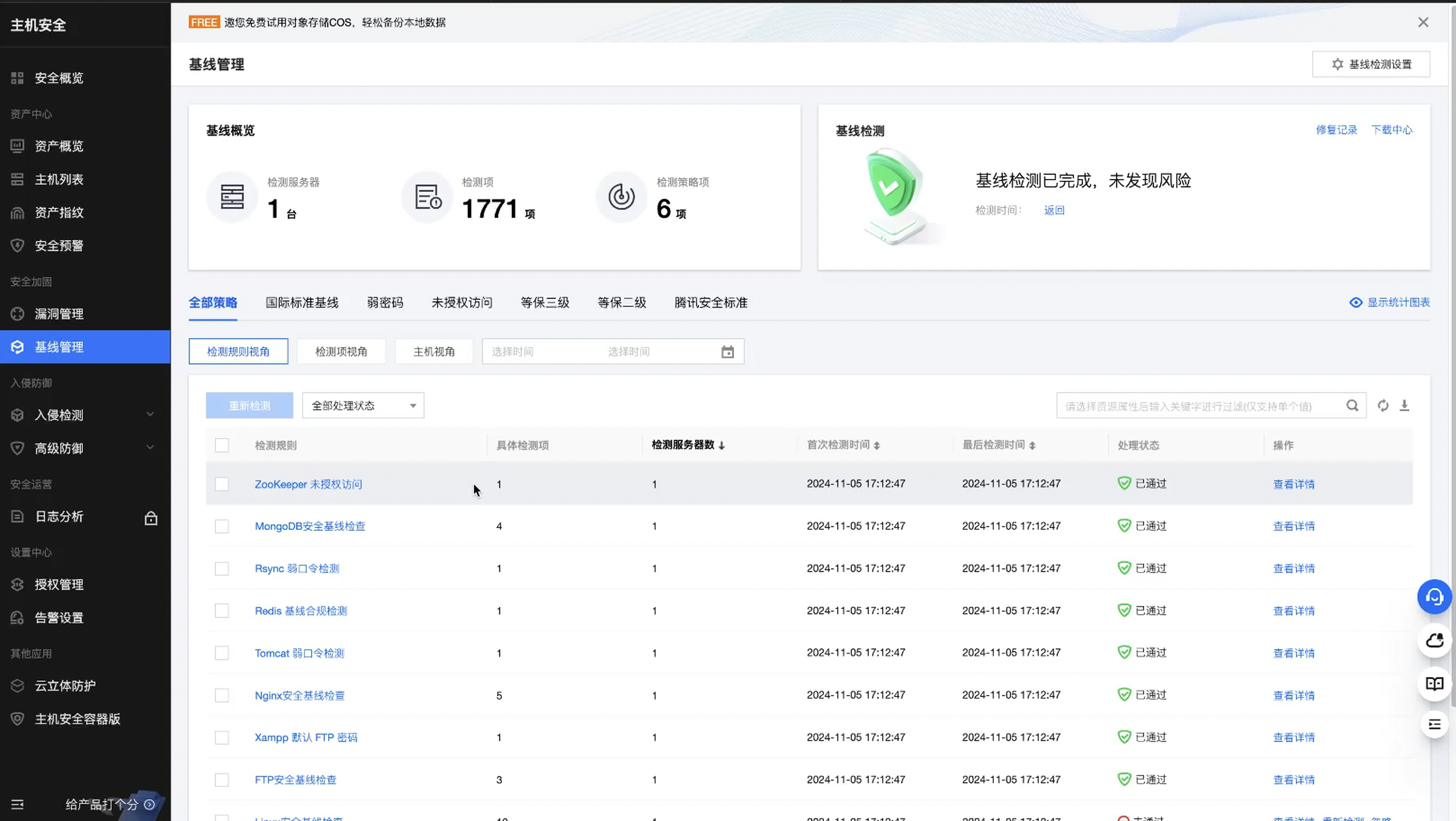 基线管理可以看到,是我们服务器的一些基础必要的检查,这里也是可以进行的。