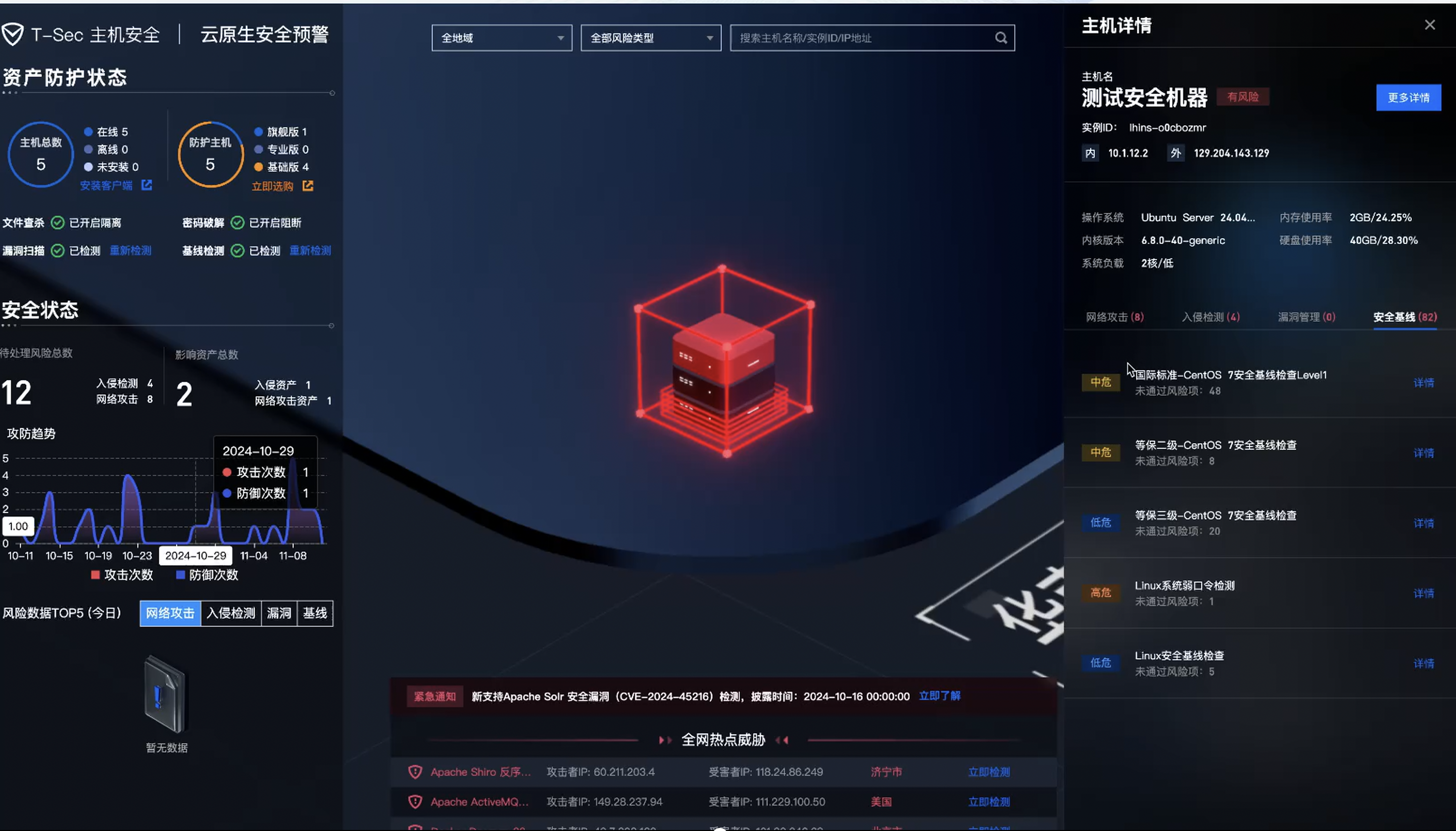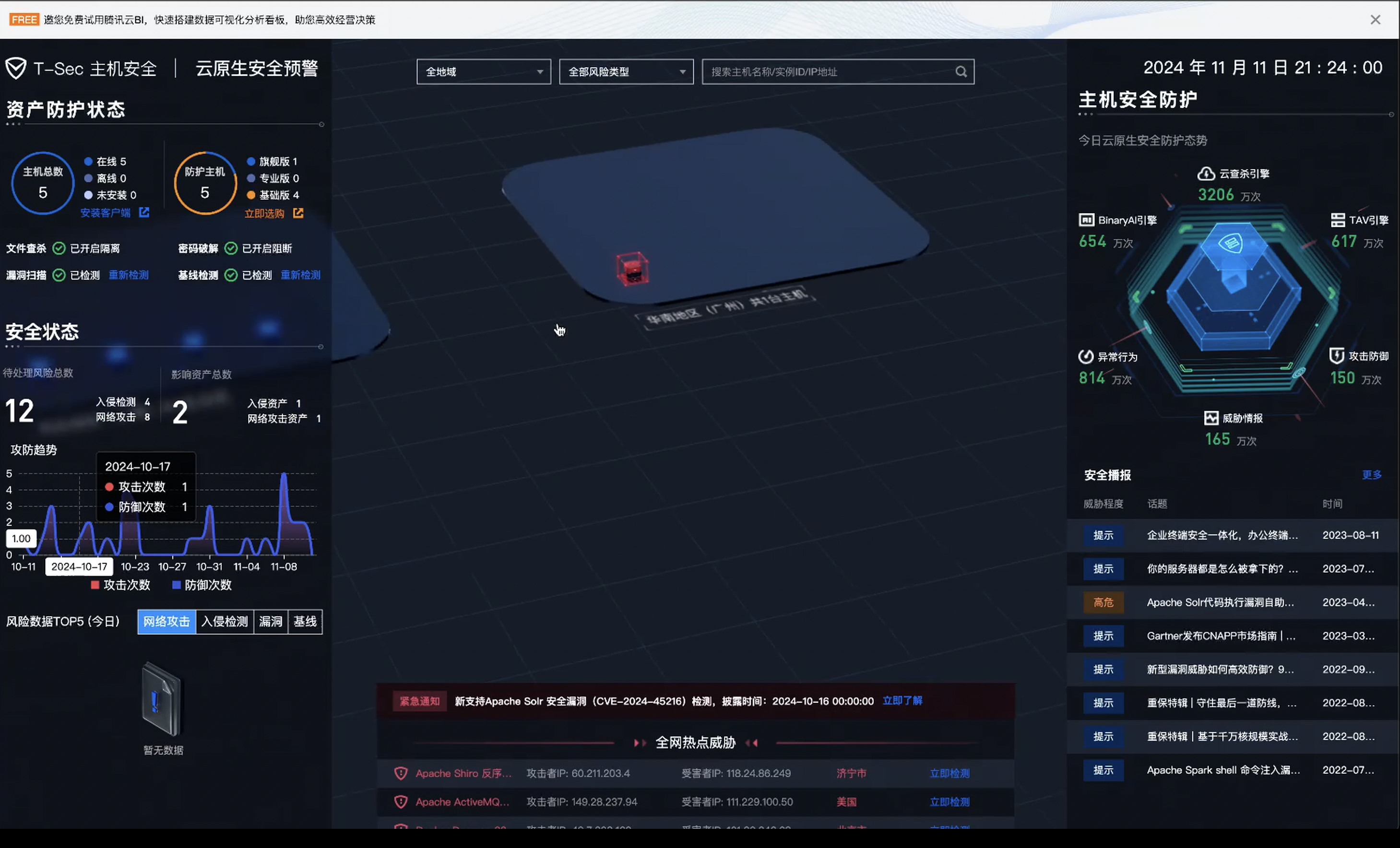 安全概况:顾名思义就是将我们的一些基础数据进行显示在页面上,比如总体的安全得分,以及风险点,网络风险,漏洞风险等等,也可以看到安全播报,那么我们可以根据现在的安全播报进行给自己的产品做安全的加固。