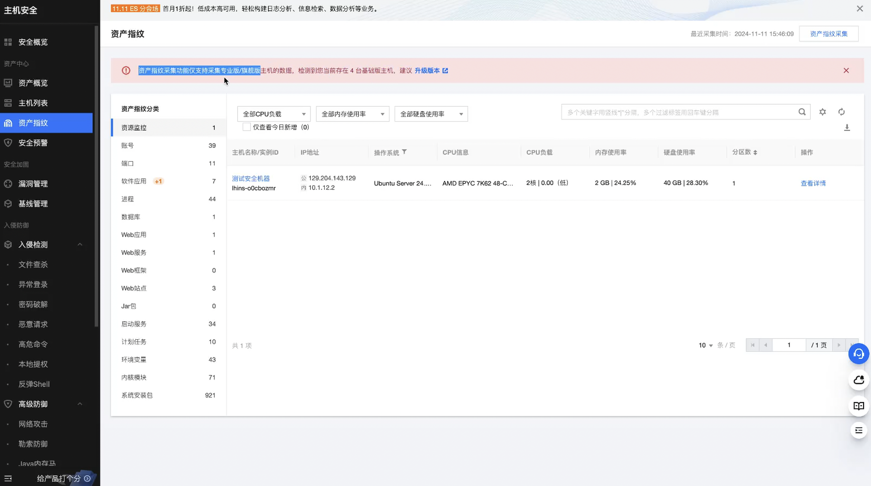 接下来看到资产指纹,这边需要注意,只可以进行采集已经授权的安全主机资产哈,其他的主机是无法进行扫描出来的。