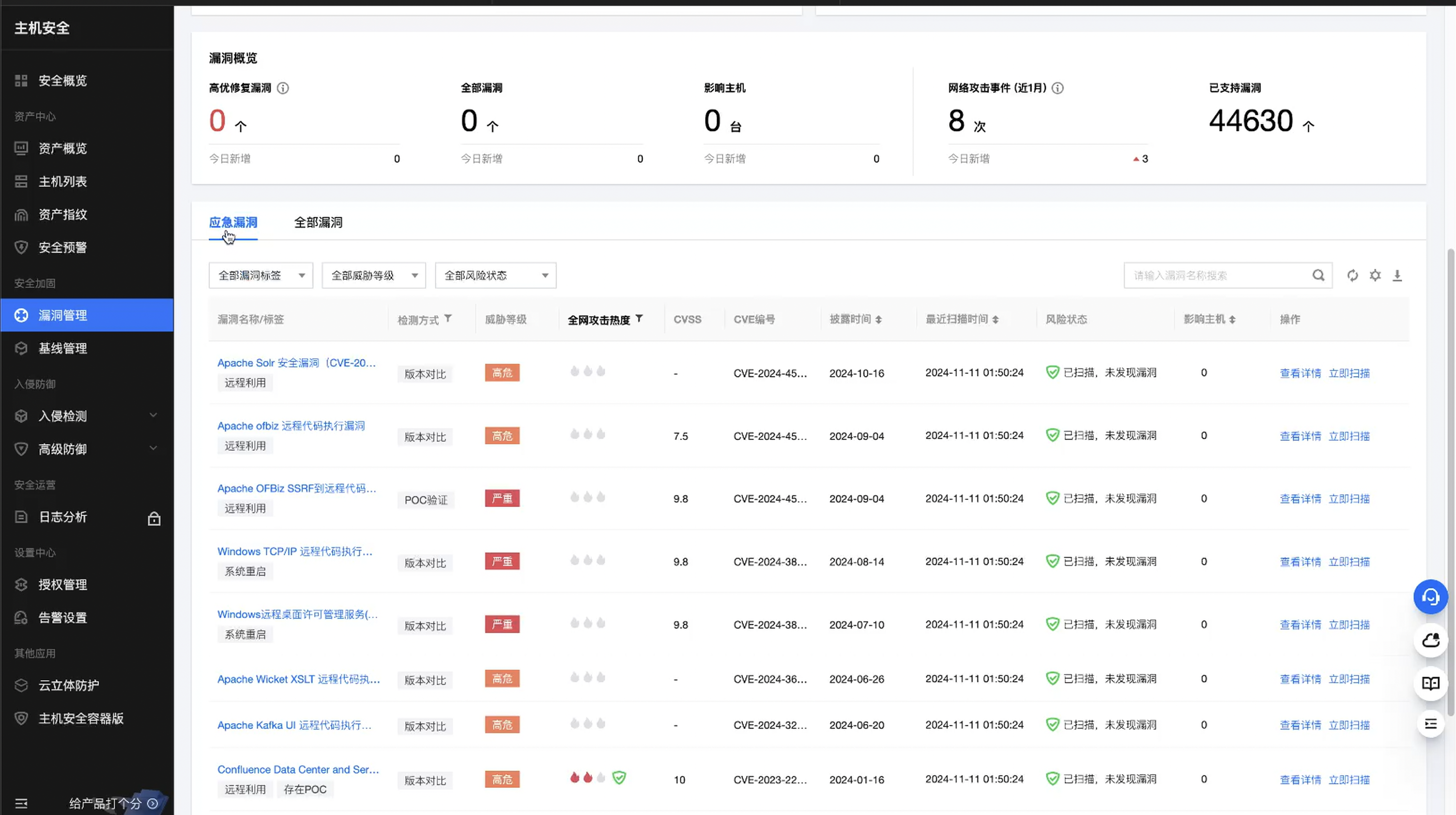 漏洞管理的话就是可以看到目前网络上有哪些我们不知道的漏洞以及基线检测可以直接进行扫描看我们的产品主机是否存在这些未发现的漏洞。