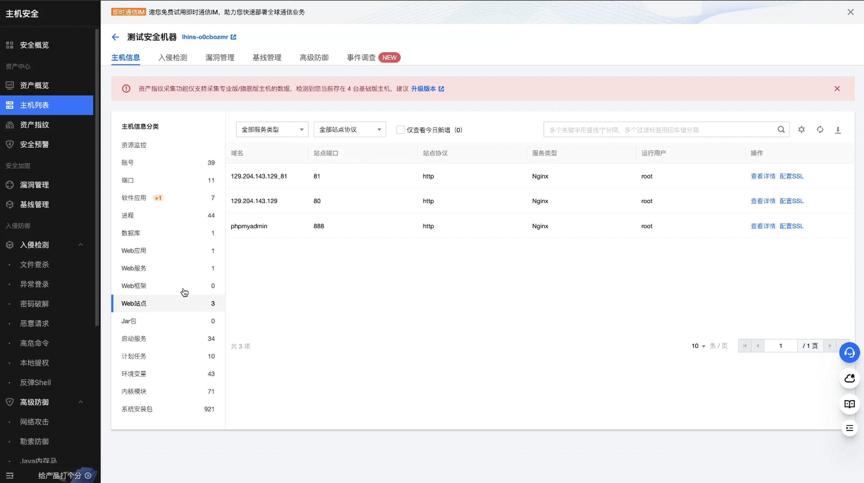 也可以点击到某一个服务器资产中查看目前的一些状态,比如网络,比如端口还可以进行看到漏洞的一些数据。有了这些数据就可以进行更好的去把现有的产品安全进行加固及时的找到漏洞及时进行修复,