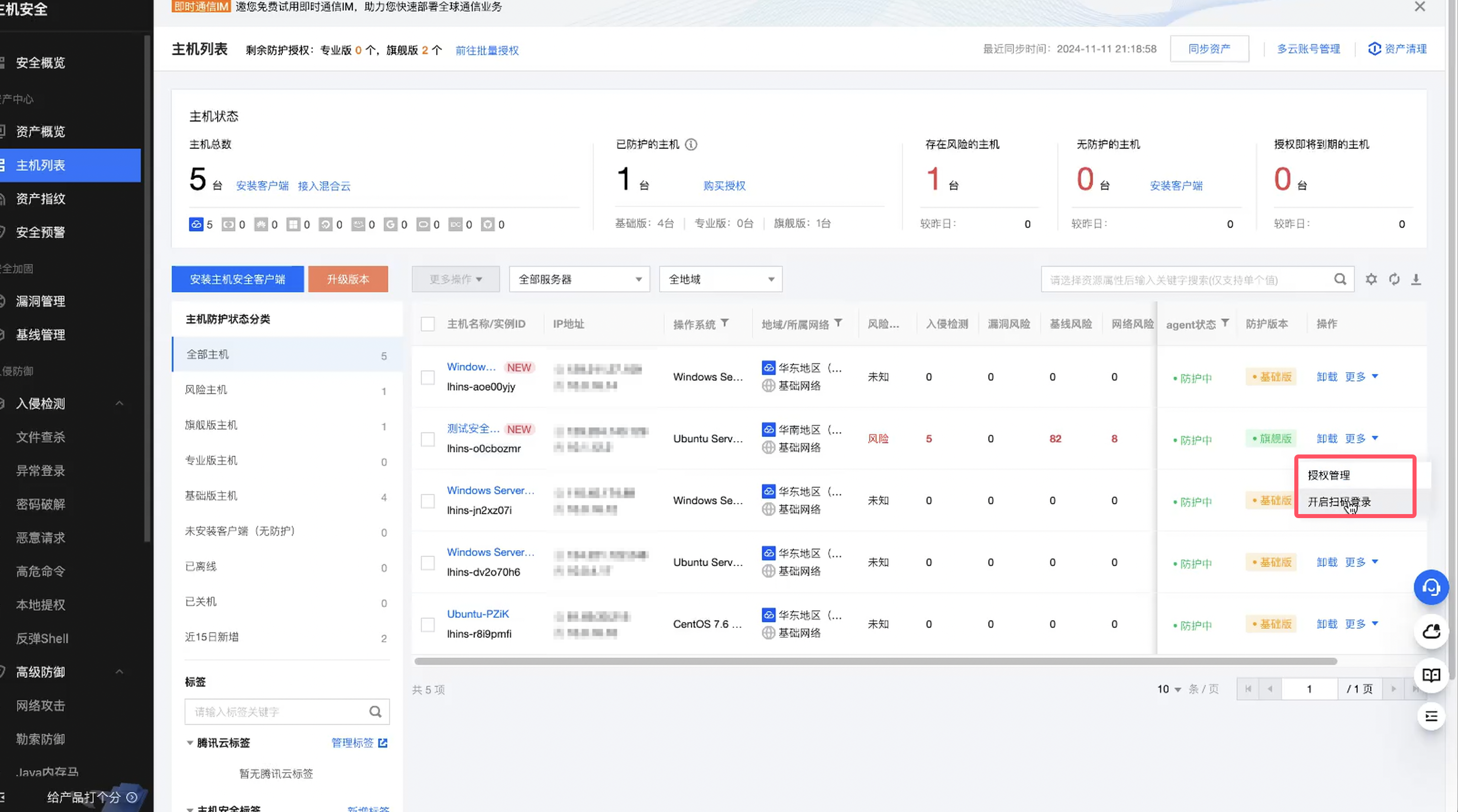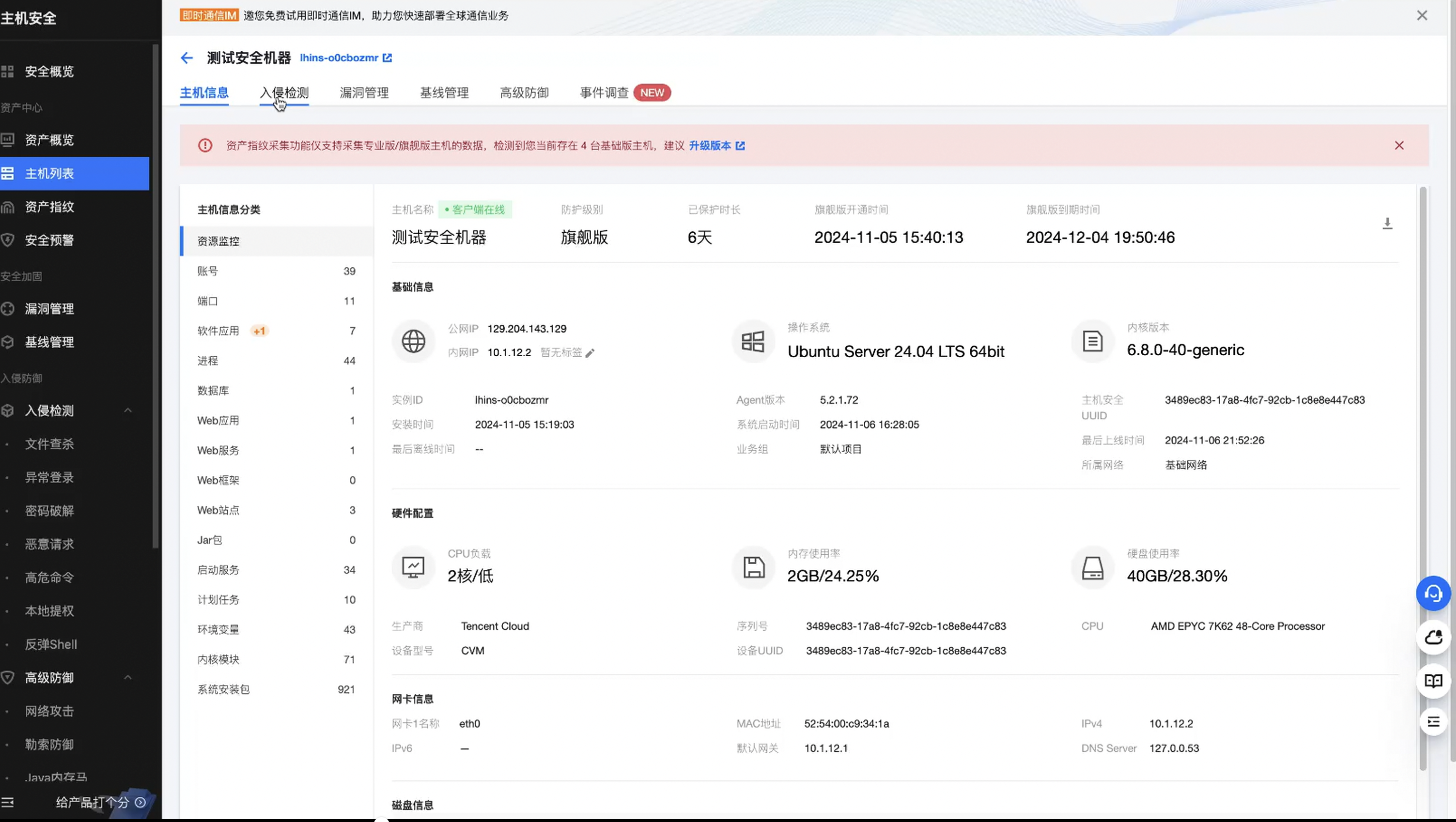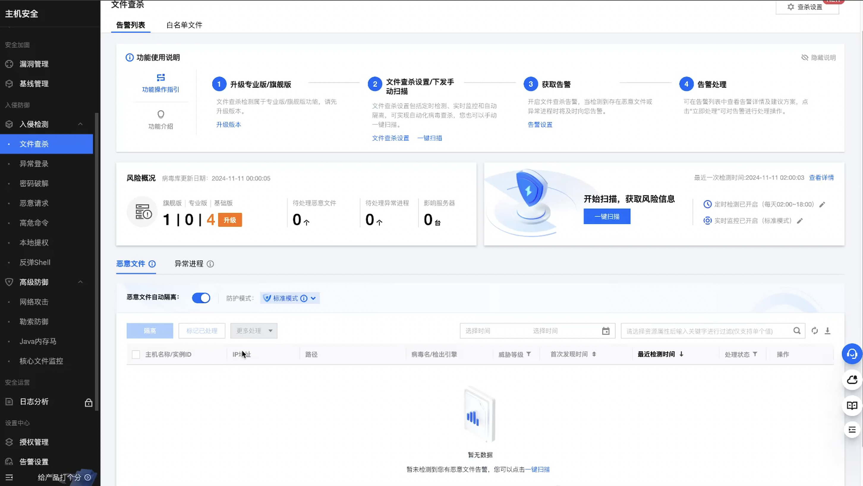 这边的话还有一些文件查杀啊,异常登录,恶意请求,高危命令,提权,等一系列的安全产品功能,大家可以进行酌情的购买使用下,体验下。