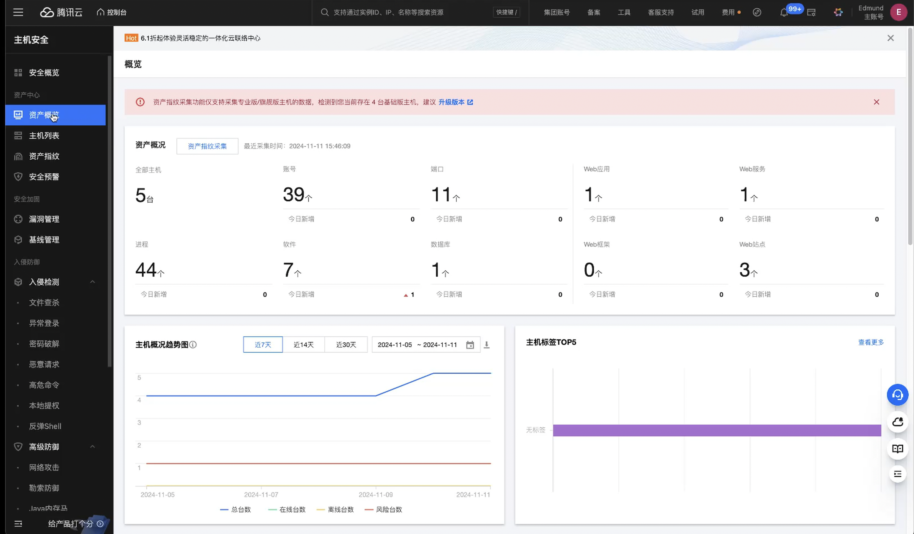 功能:资产概况,这边的话可以看到我们目前的资产以及一些账号数据,主机数据进程软件,都是可以进行看到的这样我们在观察的时候就可以采集到目前资产有新增了哪些软件进程还有可以看到负载等等。