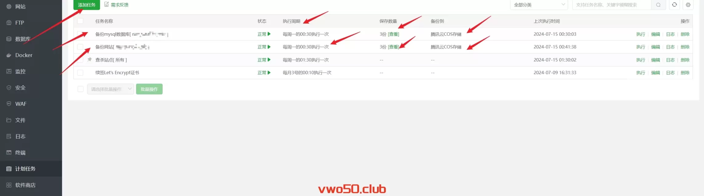 起初我想通过调用百度网盘API的方式,来定时将备份文件上传到网盘,还是大意了。百度开发者的API并没有提供上传文件的功能。 所以这次我决定一步到位,直接将备份文件上传至腾讯云COS对象存储,本来已经在找腾讯云COS的API来自己实现了,但是一看宝塔有现成的,那我们就直接用宝塔的。所以我们本篇文章将利用宝塔上的腾讯云COS插件 以及 宝塔上的定时任务来实现服务器和数据库的备份,且将备份上传到腾讯云COS