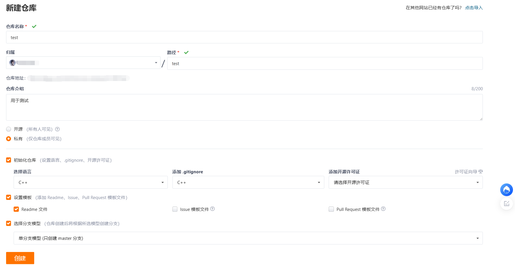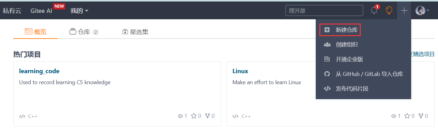 我们以 gitee 做演示如何创建远端仓库,github 也是同样的道理。