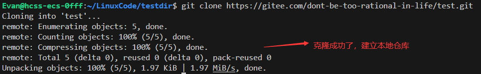 clone 指令,然后输入你 gitee 的账号和账号密码。需要注意的是,你只能将远端仓库 clone 到空目录,一个目录下只能有1个本地仓库。