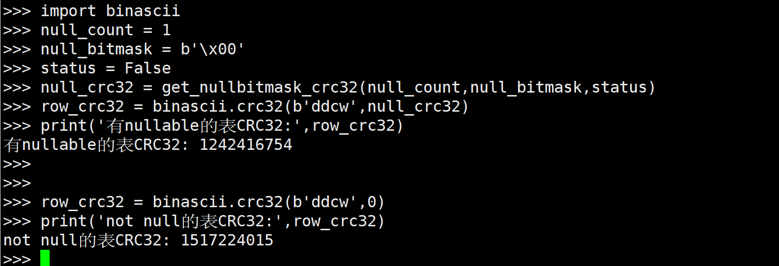 bdata: innodb记录的int,bigint的二进制数据 其它的均直接binascii.crc32(bdata,crc32)