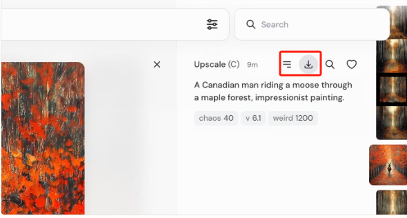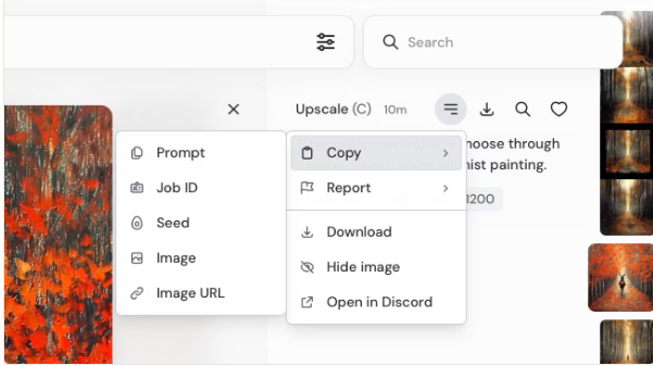 我们还可以点赞我们的图片(心形图标)或在 Midjourney 上搜索类似图片(放大镜图标)。按钮(三条水平线)允许您复制图片的各个方面、报告图片或在 Discord 中打开图片