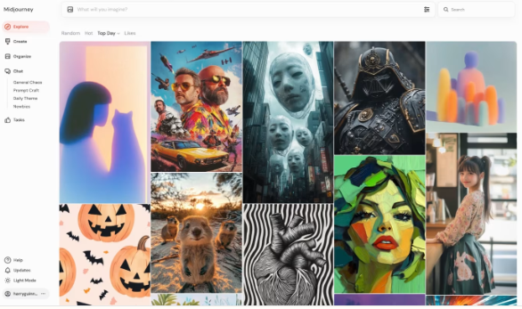 Midjourney 旨在成为艺术家的社区工具,这也是它最初在 Discord 上推出的原因。因此,登录后你首先看到的是过去一天最受欢迎的图片集。