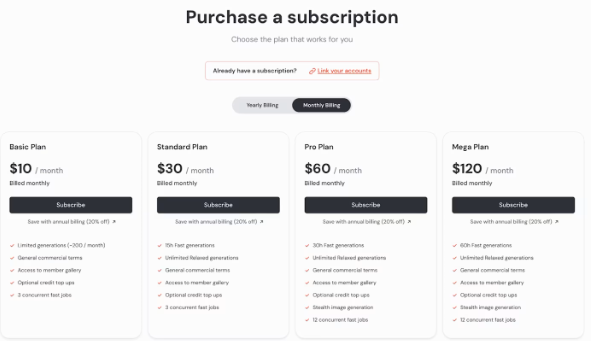 不幸的是,Midjourney 并不一直提供免费试用。要开始生成图像,您需要订阅一个计划。基本计划起价为每月 10 美元,每月可生成约 200 幅图像,超级计划起价为每月 120 美元,可快速生成约 3,600 幅 AI 生成的图像,如果您愿意等待一段时间,还可以无限生成图像。
