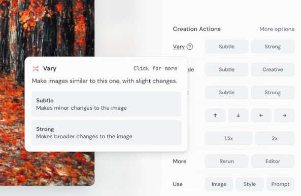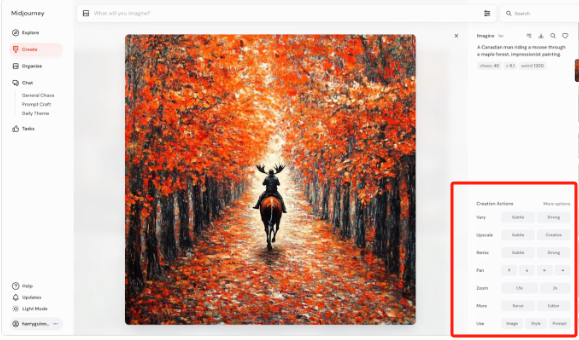 Midjourney 的一大优点是我们可以自由编辑图片。如果我们喜欢某张图片,点击它即可调出选项。
