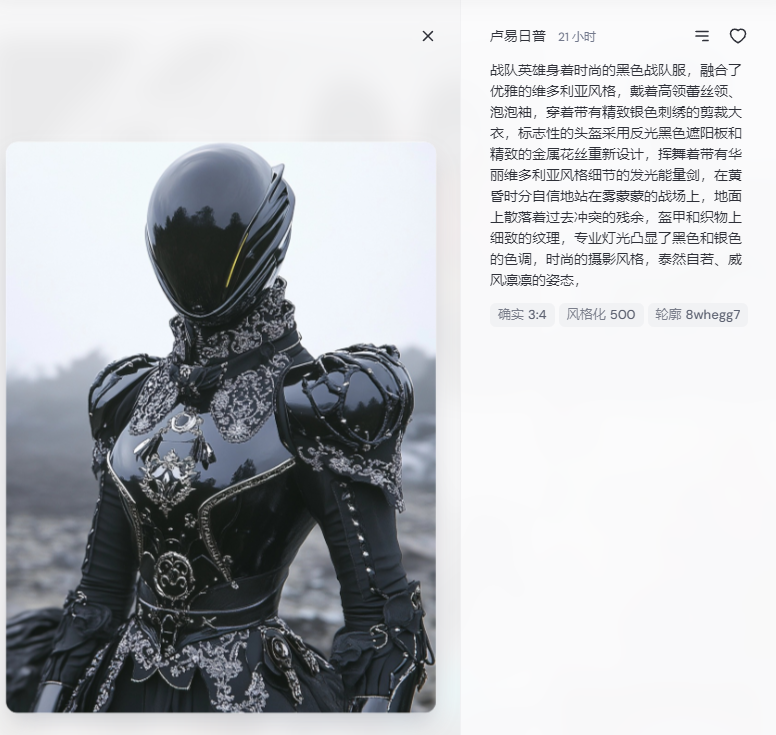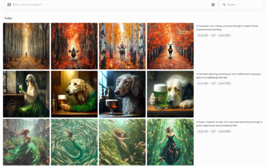 我们可以单击它们并查看创建它们的提示和设置。 左边是图片,右边是生成这张图片的提示词,所以我们可以从这些每日推荐中,看到这些提示词,屏幕右上角的搜索栏可让您查找与特定主题或主题相匹配的图像每一个图像都是公开的。