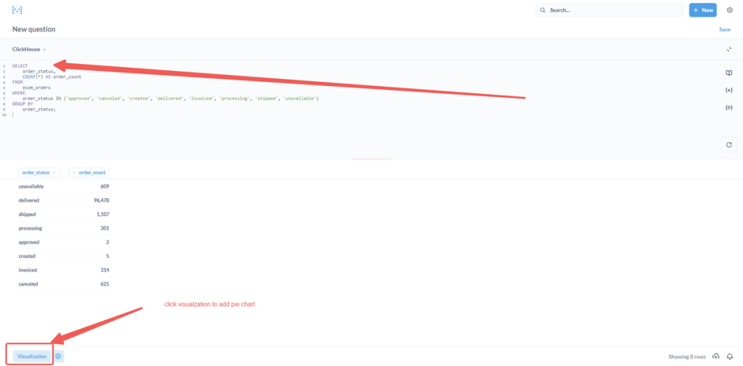 例如,若要按状态统计订单数量,可以使用以下查询:点击【运行 Run】按钮(或【执行 Execute】)以执行查询,并在表格中查看结果。